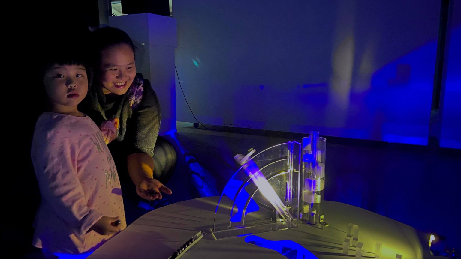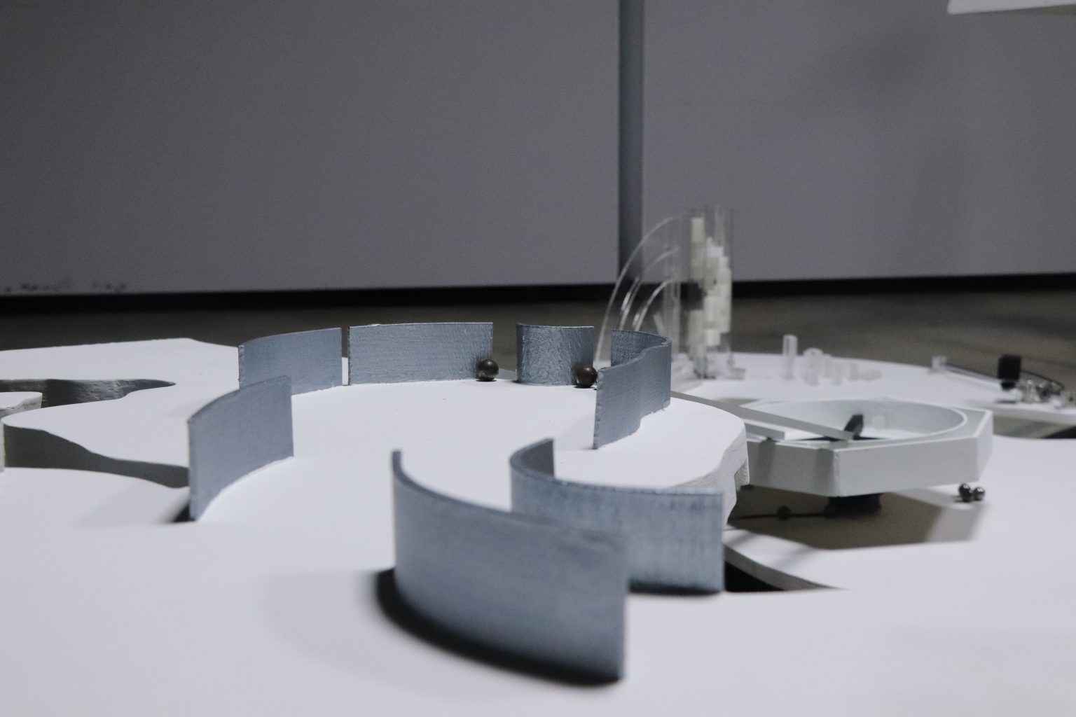 就在水流移動的同時,下方的圓塔正將鋼珠層層送至頂端,並滑落到一旁的摩天輪。謝竺勳提到,傳送鋼珠的圓塔如同城市林立的高樓大廈,而鋼珠依序進入、上升至圓塔頂部,則比擬每日搭著電梯移動的上班族。水最終流至平台底部,而坐落一旁的彈珠台,則將鋼珠一顆顆發射出去,讓鋼珠依循軌道衝刺而下,落至旋轉的圓環中。程壬宣解釋,這裡的鋼珠就像在城市移動的鐵件,「可以是捷運或是汽車,代表人的移動。」鋼珠滾動產生撞擊與摩擦聲,就像捷運在鐵軌運行的聲響,是城市擁有的聲音。
