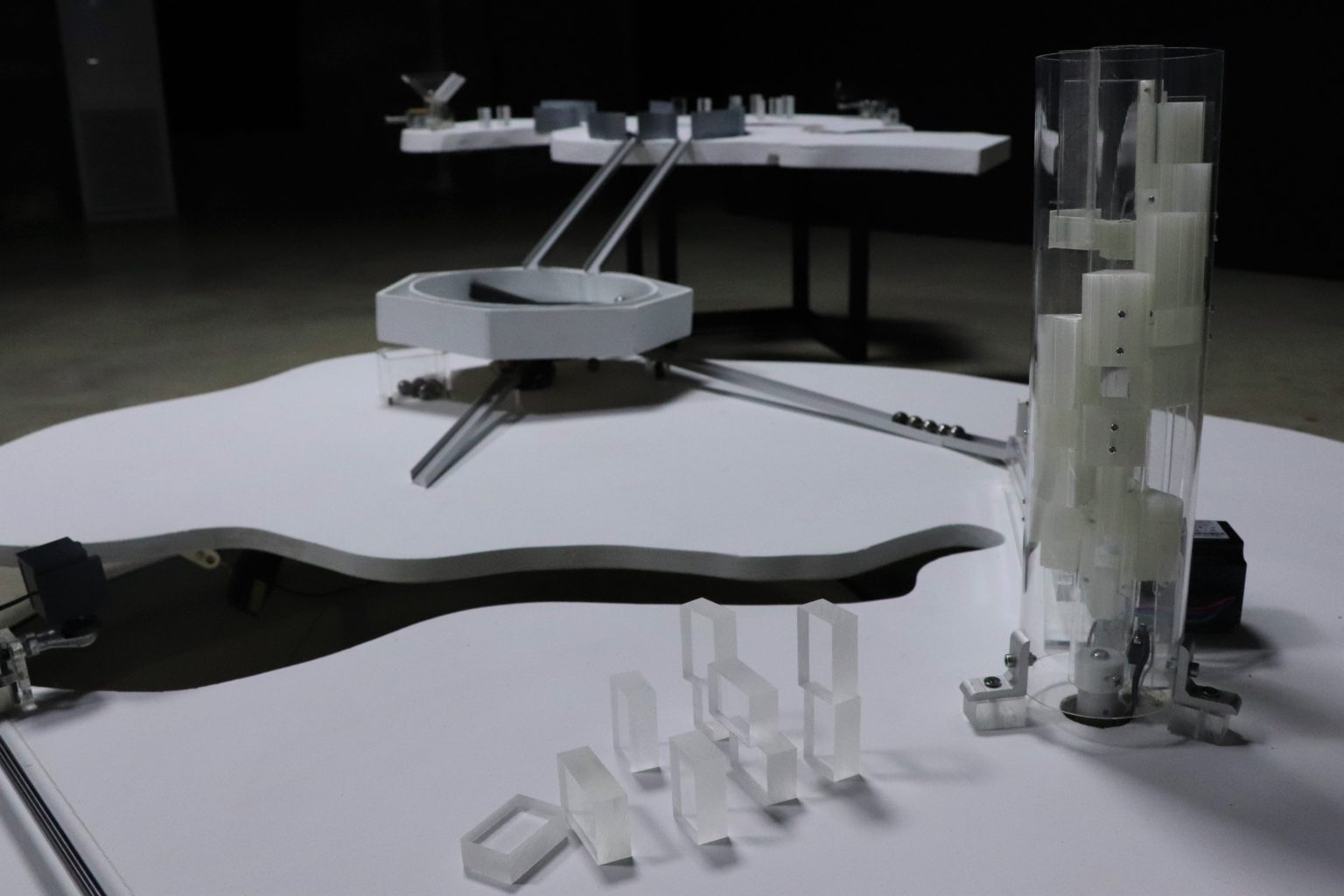 作品模擬未來城市「渦城」的樣貌,由白色的塊狀平台搭建而成,分為四個區域。平台透過高低不一的編排,經由水的串流與軌道的連接,分別表現城市的自然景象、建築、運輸工具與時間。散落在平台上的壓克力塊如同高樓窗台,透過燈光映照,形成高樓被陽光照射後所產生的陰影。而獨立於整體城市的滴水裝置,藉由規律的滴水聲,建構城市在忙碌與吵雜中,仍然有一處具有韻律的平靜角落。