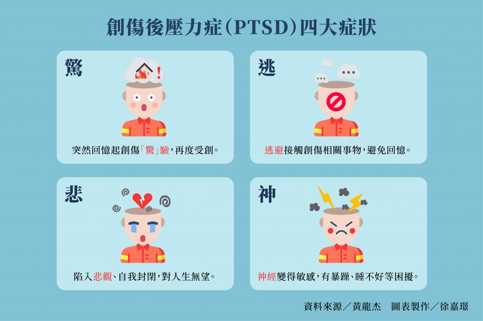曾多次協助災後輔導的心理師黃龍杰指出,人在歷經重大創傷後易出現「驚」驗重現、逃避忌諱、悲觀感想、神經過敏四大症狀,稱為「創傷後壓力反應」(Post-traumatic Stress Reaction, PTSR),一般為暫時現象。倘若事發一個月後症狀仍持續出現,就可能演變為PTSD。此外,亦有少數人屬於遲發性PTSD,約半年後才開始產生症狀。