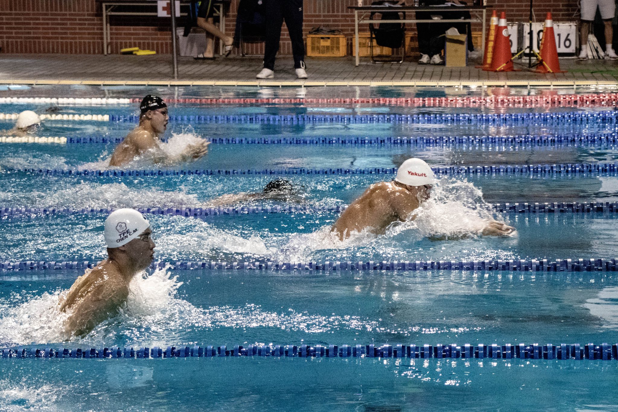 出發訊號聲響起,選手奮力跳入水中,激起大量水花。109年全國冬季短水道游泳錦標賽(以下簡稱短水道錦標賽)10日至14日於國立中正大學游泳池盛大登場。其中,18及以上歲級男子組100公尺蛙式決賽,由來自國立臺灣師範大學的國手吳浚鋒以59秒14,一舉刷新全國及大會紀錄59秒88,強勢摘金。國立臺灣體育運動大學蔡秉融與臺北市立大學陳志明一路緊追在後,分別繳出59秒32、59秒57的成績,同樣打破全國及大會紀錄。